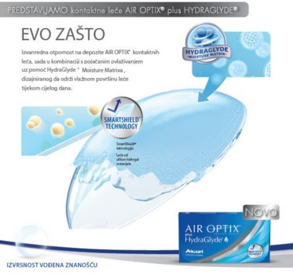 Air Optix plus Hydraglyde kontaktne leće sadrže SmartShield tehnologiju koja stvara ultra-tanak zaštitni sloj kako bi štitila Vaše leće od nakupljanja depozita koji se nakupljaju tijekom mjesec dana kao što su