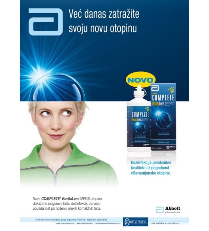 COMPLETE® RevitaLens je zaštita protiv širokog spektra potencijalno opasnih miokroorganizama i ima bolju podnošljivost, što rezultira smanjenom iritacijom i zamućenjem rožnice, pa nositeljima hidrogelnih leća daje osjećaj iznimne udobnosti.