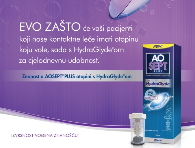 Nova AOSEPT PLUS otopina za čišćenje i dezinfekciju s HydraGlyde Moisture Matrix omogućava snažno čišćenje i pouzdanu učinkovitost dezinfekcije klinički dokazanom AOSEPT PLUS otopinom – s dodanim ovlaživačem za cjelodnevnu udobnost.