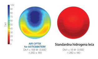 Revolucionarnom sintezom silikona i hidrogel materijala dobivamo visoku propusnost kisika (Dk/t = 108). Air optix za astigmatizam propušta do 6 puta više kisika nego hidrogel kontaktne leće za astigmatizam s niskoim Dk/t , pomaže zaštiti od simptoma vezanih uz nedostatak kisika (simptomi kornealne hipoksije), te osigurava oči zdravog izgleda, bez crvenila.