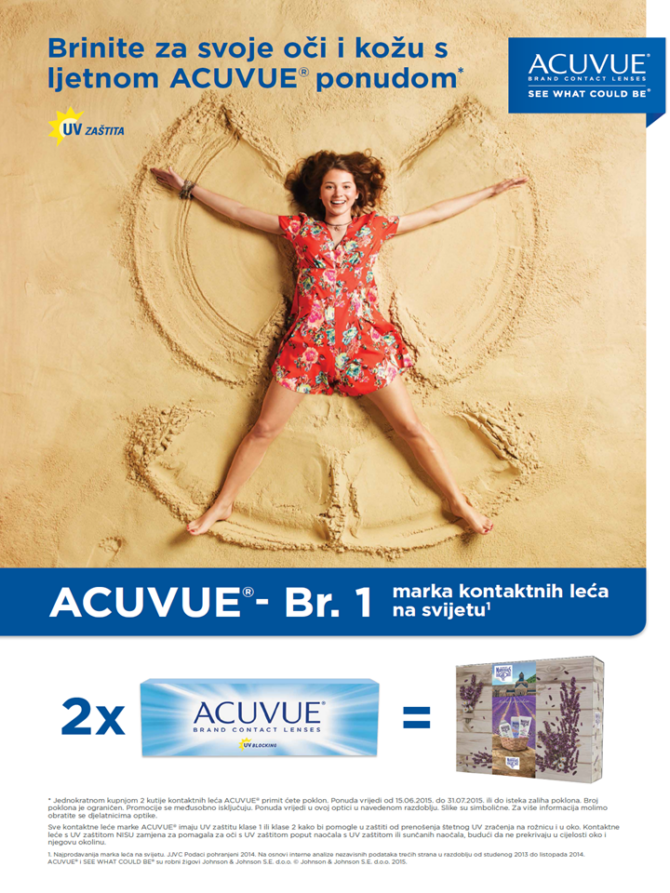 Ovom Vas prilikom želimo pozvati na posebnu promociju namijenjenu nositeljima kontkatnih leća 1 DAY ACUVUE TRUEYE, 1 DAY ACUVUE MOIST, 1 DAY ACUVUE MOIST for ASTIGMATISM, ACUVUE OASYS i ACUVUE OASYS for ASTIGMATISM, a i svim koji žele početi nositi kontaktne leće!