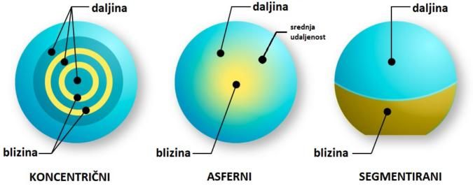 Postoji nekoliko vrsta dizajna multifokalnih leća: koncentrični, asferični i segmentirani.