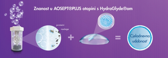 Nova AOSEPT PLUS otopina za čišćenje i dezinfekciju s HydraGlyde Moisture Matrix omogućava snažno čišćenje i pouzdanu učinkovitost dezinfekcije klinički dokazanom AOSEPT PLUS otopinom – s dodanim ovlaživačem za cjelodnevnu udobnost.