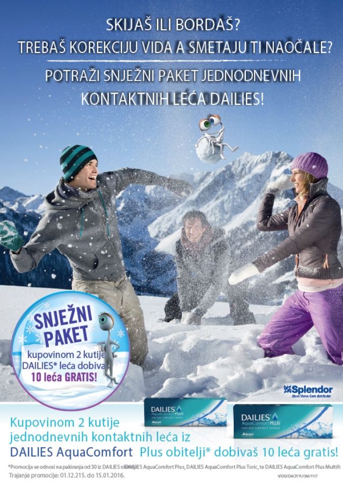 Tu su DAILIES jednodnevne kontaktne leće – jednostavno rješenje! Ujutro ih stavite i navečer bacite – nema čišćenja ni održavanja. Puno su praktičnije za zimske sportove nego dioptrijske naočale – uz njih možete bez problema nositi skijaške naočale ili svoje omiljene sunčane naočale.