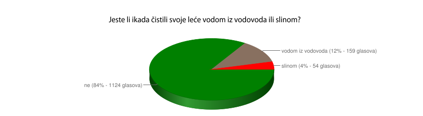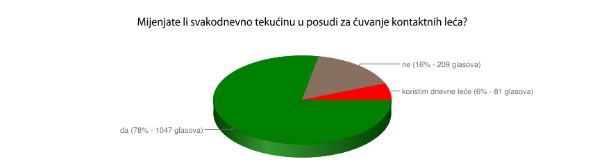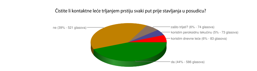 Iz ovih grafova možemo zaključiti da se korisnici kontaktnih leća loše odnose prema higijeni kontaktnih leća, posudi za održavanje i ne pridržavaju se uputa za nošenja kontaktnih leća. 16% korisnika posprema svoje kontaktne leće u već korištenu tekućinu! Nakon skidanja 45% korisnika svoje kontaktne leće ne čisti odgovarajućim postupkom. 16% korisnika kontaktne leće čisti vodom ili slinom, što je strogo zabranjeno. Još lošiji postotak korisnika, njih 38% neodgovarajuće čisti posudu za kontaktne leće. Ti postoci pokazuju da veliki broj korisnika ne pridržava se dobivenih uputa ili upute koje dobiju su nejasne ili površne.