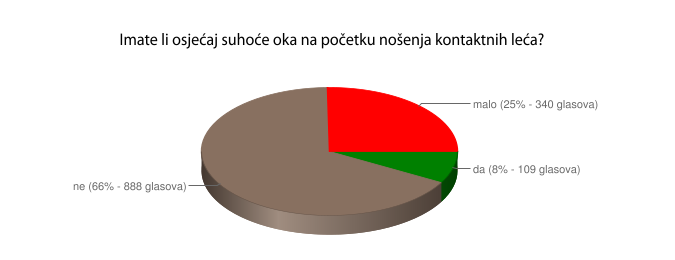 33% korisnika već pri samom početku osjeća neudobnost prilikom nošenja kontaktnih leća. Taj postotak na kraju dana raste i do 80%. Jedan od razloga tako velikom postotku neudobnosti je loša higijena, dugodnevno nošenje hidrogelnih kontaktnih leća (više od 10 sati), te nepravilna zamjena kontaktnih leća. Također možemo vidjeti da si mali dio korisnika pomaže umjetnim suzama. Kako imamo veliki postotak neudobnosti prilikom nošenja kontaktnih leća, iznenađujuće je da većina korisnika je zadovoljna svojom oštrinom vida.